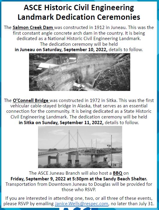 The ASCE Alaska Section has worked for nearly a decade to recognize two Alaskan Historic Landmarks: the Salmon Creek Dam in Juneau, and the O’Connell Bride in Sitka.