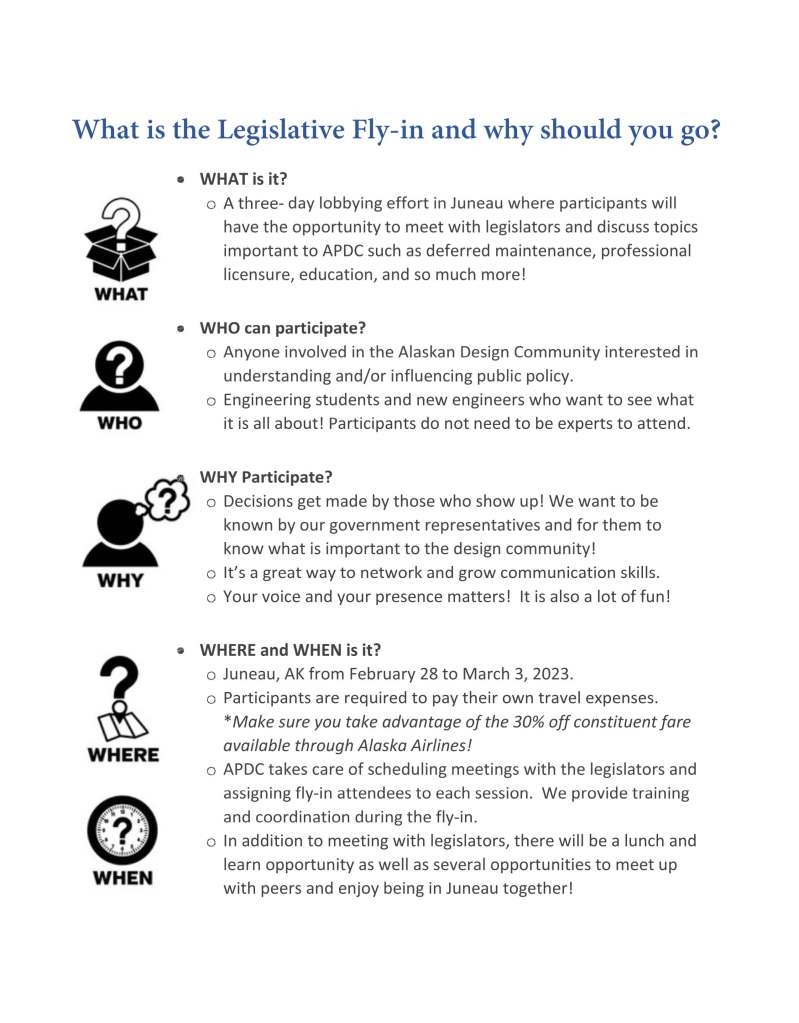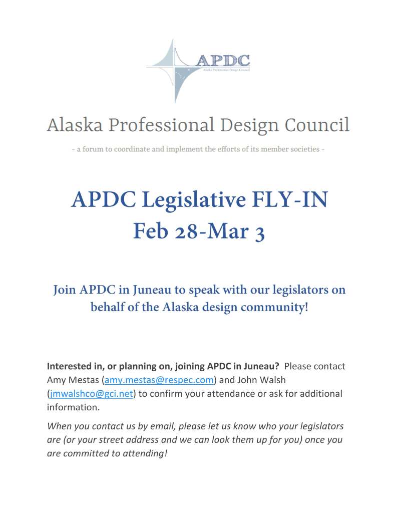 APDC Fly-In 2023 January 27, 2023 Alaska Professional Design Council Share this: Click to share on X (Opens in new window) X Click to share on Facebook (Opens in new window) Facebook Like Loading... Related Published by Alaska Professional Design Council View all posts by Alaska Professional Design Council
