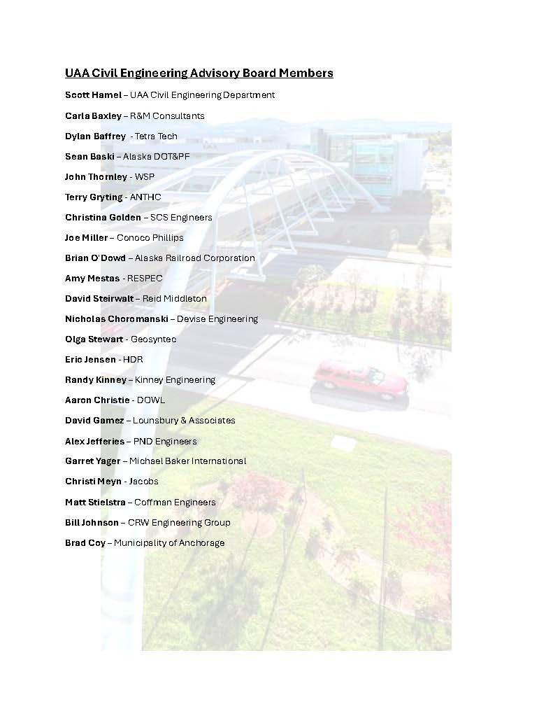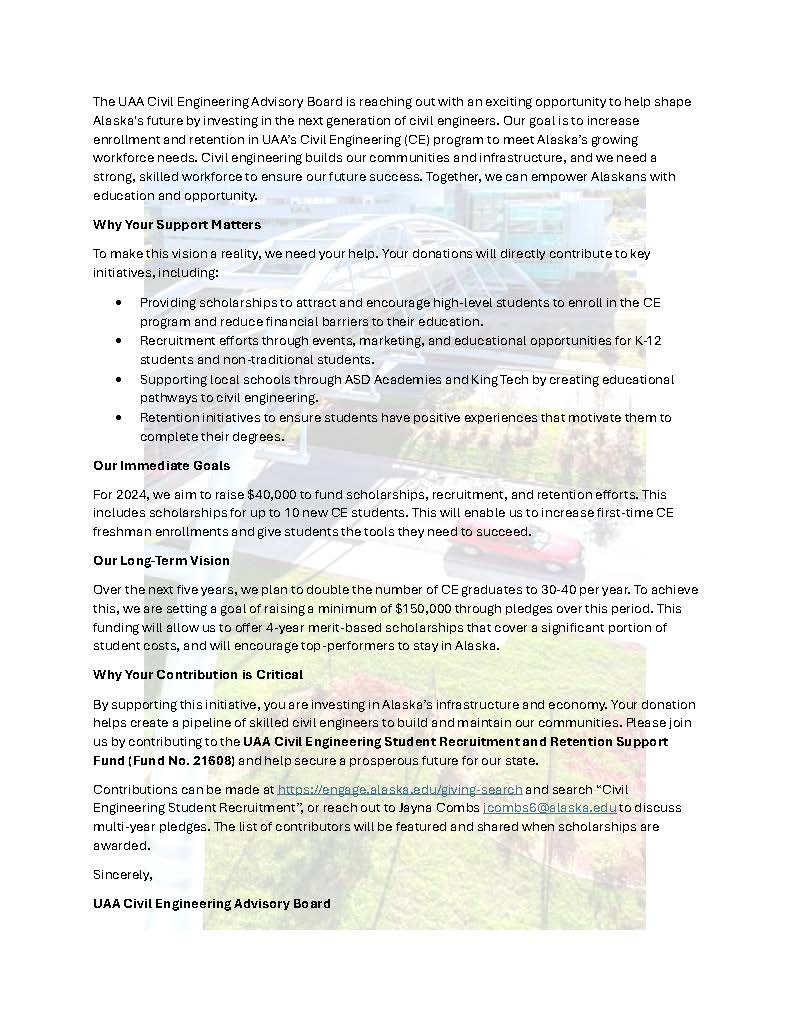 The UAA Civil Engineering Advisory Board is reaching out with an exciting opportunity to help shape Alaska’s future by investing in the next generation of Civil Engineers. Their goal is to increase enrollment and retention in UAA’s Civil Engineering (CE) program, to meet Alaska’s growing workforce needs. Contributions can be made directly at the following link (search: Civil Engineering Student Recruitment), or by reaching out to Jayna Combs (jcombs6@alaska.edu) to discuss multi-year pledges. See below for the full flyer from the Advisory Board.