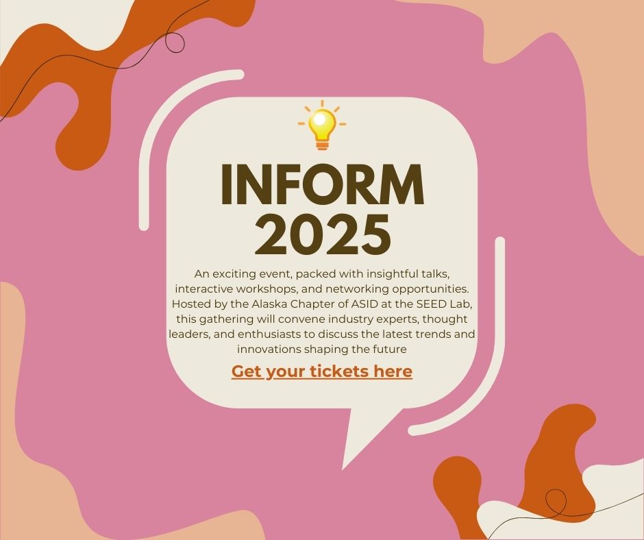 On Wednesday, February 19, 2025 from 9:30 am – 4:30 pm, the Alaska Chapter of ASID (The American Society of Interior Designers) will be hosting their annual full-day of learning, Inform 2025, at the Seed Lab in Anchorage, AK.